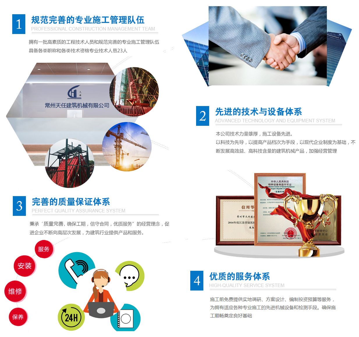 公司主要從事施工升降機(jī)、普通塔式起重機(jī)的制造、租賃、安裝、改造與維修等一條龍服務(wù);擁有施工升降機(jī)(SCD200/200、SC200/200),QTZ63型普通塔式起重機(jī),物料提升機(jī)(GJT10A)三大系列產(chǎn)品,并有中華人民共和國特種設(shè)備檢驗(yàn)檢疫總局頒發(fā)的制造、改造與維修生產(chǎn)許可證。